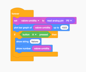 Questo tipo di configurazione va bene per Micro:bit ma ovviamente è identica anche nel caso di Arduino, Raspberry Pi o altre schede. Con questo tipo di sensori si tratta sempre di andare a leggere un valore direttamente da un pin e i questo caso il valore sarà compreso tra 0 e 1023.